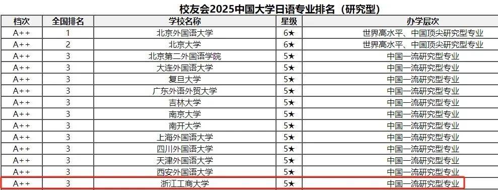 浙商大日语专业是11家首批国家级一流本科专业建设点之一,还是浙江省“十三五”特色专业。在2025年校友会中国大学日语专业排名中,获评等级“A++”,全国并列第三。