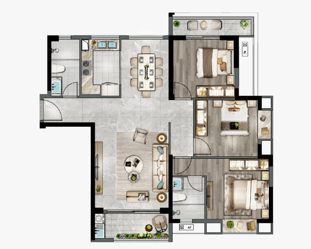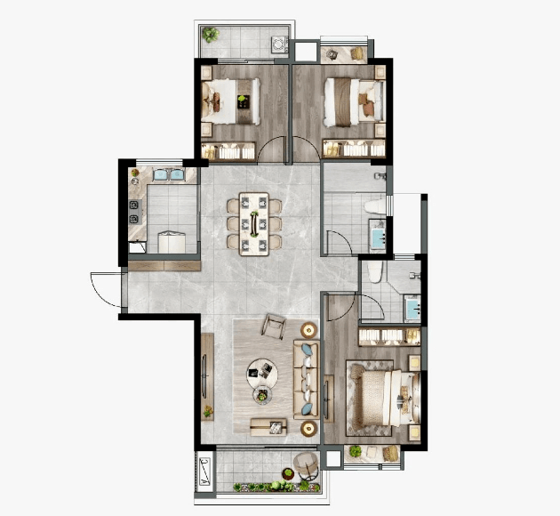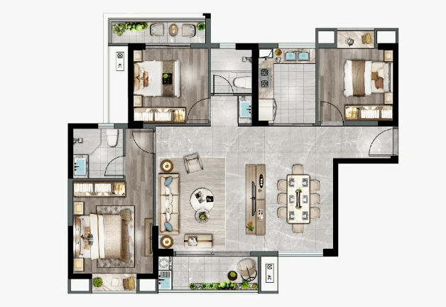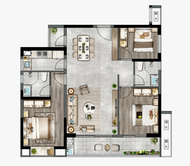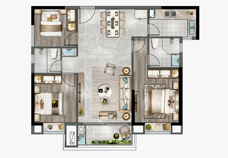 该户型位于边套,三面临窗的布局规划,实现多角度采光面;动静分区明显,真正做到会客、休息互不干扰。