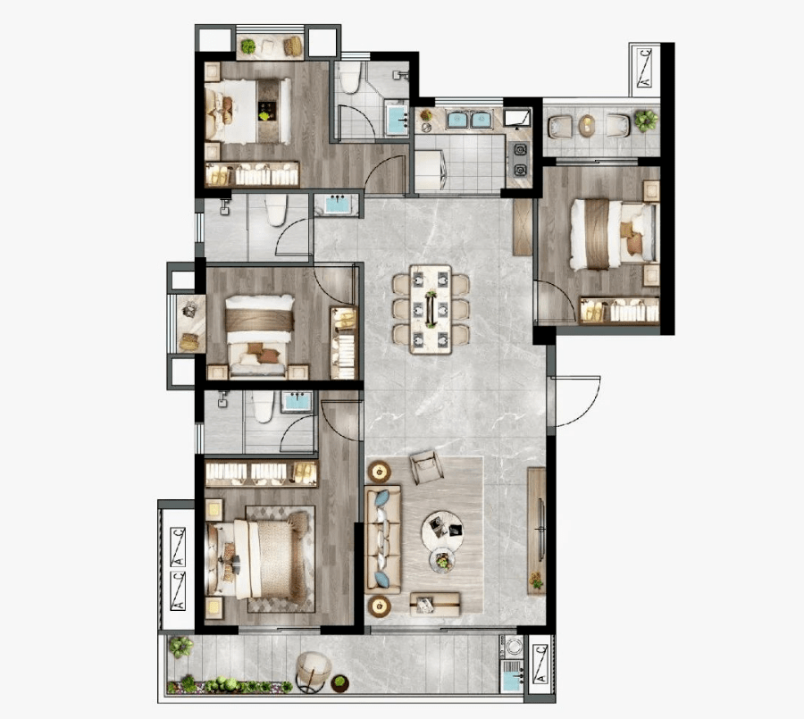 该户型设计约40㎡的双厅空间,满足闽南人“大厅”的会客需求;约8.5米南向阔景阳台,无论是生活、观景需求都可得到满足;4个房间3个卫生间设计,可满足二孩、三代同堂居住改善需求。