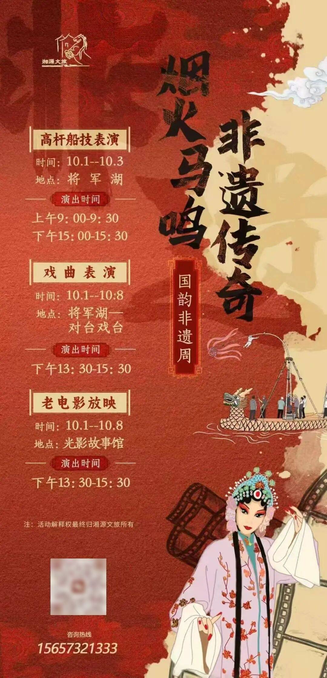 假期期间,马鸣村将每天安排非遗演绎,表演项目主要有国家级非遗高杆船技、对台戏等,光影故事馆也将推出国庆电影周活动,免费放映经典电影。