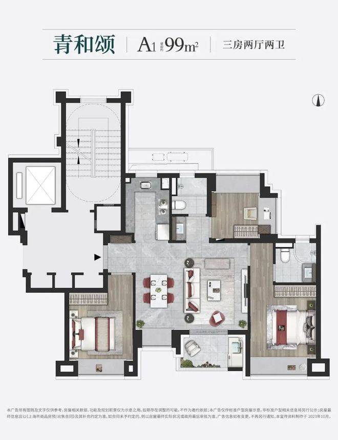 建面约99㎡爆款户型约99㎡3房2卫户型是上海市场中最主流的面积段之一,但印象青城的户型设计却超脱以往。四开间朝南的设计,让室内的采光相当出色。