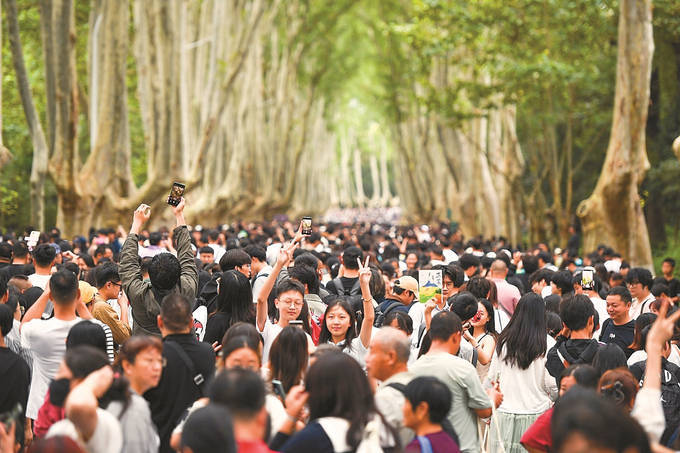 场景的营造,更体现在对城市公共空间的重新赋能。陵园路上,约800米长的梧桐大道首次在假期开启了“步行道”模式。车辆禁行,行人成了道路唯一的主人。一位值守的民警站在升降执勤台上,视野开阔,他手中的小喇叭不时传出平和清晰的指引:“明孝陵向左走”。这个执勤台意外成了游客眼中的“黄金机位”,不少人举着手机,请民警帮忙记录下与“最美梧桐大道”的合影。空中有警用无人机巡航,路面有女子巡逻队穿梭——一个“安心且温馨”的漫步场景被完美构建。政策的调整,在此刻化为了极具温度的人文关怀。