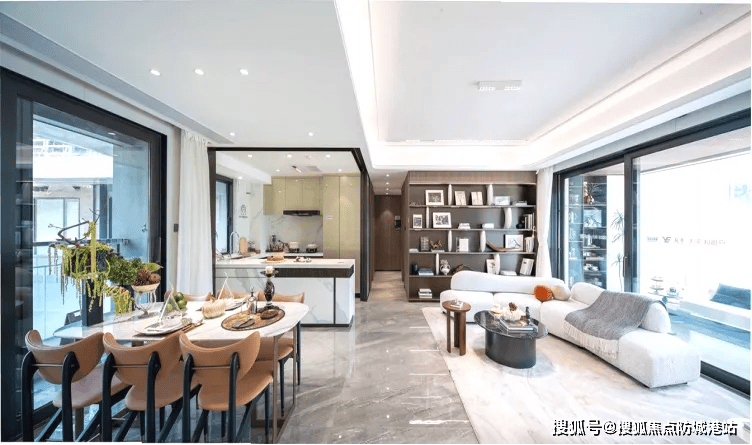 户型的核心亮点是约70平方米的LDKG无界方厅,开间约5.7米、纵深约9.5米,将客厅、餐厅、厨房、阳台融为一体,形成了开阔的公共活动空间,无论是家庭聚会还是朋友宴请,都能轻松容纳。长达约9米的跑道式阳台,进深约2.4米,空间充足,可根据需求布置健身区、花园、茶室等,打造专属的休闲空间。