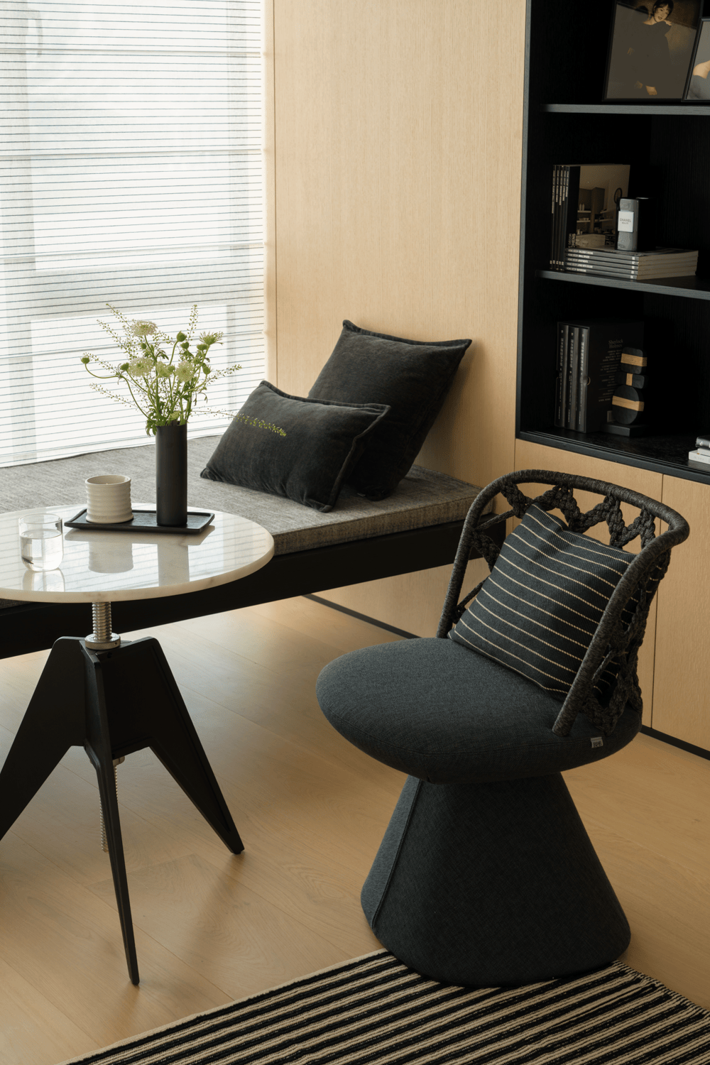 作为入户第一幕,玄关以极简姿态开启生活叙事,素净墙面如天然画布。清透支架托举着素白花瓶,植物姿态俏皮延展,成为连接户外与生活的温柔过渡。