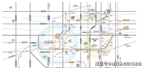 但随着广州城市发展战略的南拓推进,南站板块迎来了历史性发展机遇。广州“十四五”规划明确将南站定位为四个枢纽型国际商圈之一,板块发展步入快车道。根据规划,南站板块将构建“一轴两涌+一核五区”的空间布局,打造“站城一体、业态融合的大湾区门户枢纽”和世界级文商旅目的地。