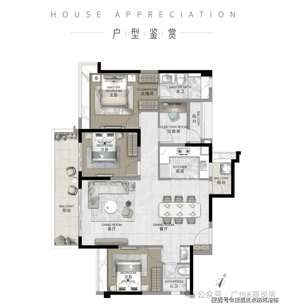 采光方面,户型拥有约13.9m超大南向采光面,大面宽采光面搭配超大方厅,让室内空间明亮通透。主卧为豪华主卧套,配备超大270°转角飘窗,提升居住舒适度。所有房间均赠送飘窗,阳台面积赠送一半,性价比突出;双面景观阳台搭配满飘窗,约6.8m面宽超大阳台,最大化利用景观资源,为业主带来极佳的居住体验。