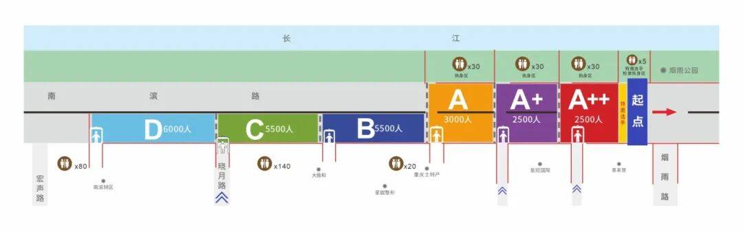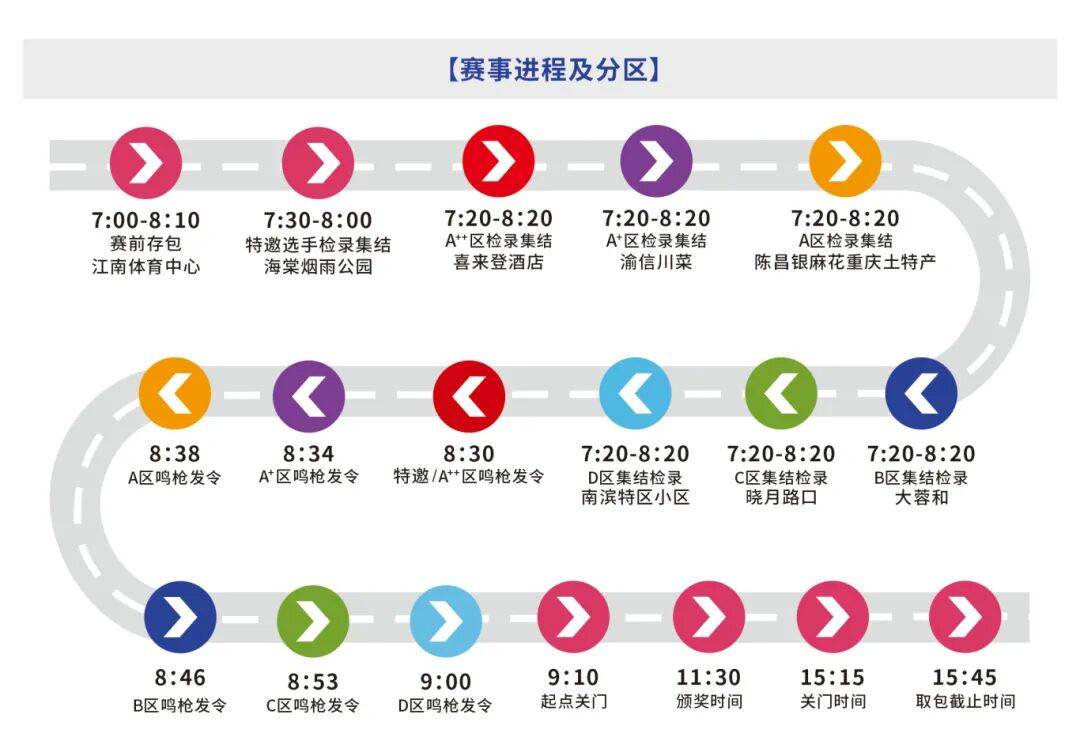 3.特殊情况说明:允许前区选手进入后区检录起跑(例如A区选手可至B区起跑),严禁后区选手进入前区起跑(例如B区选手不可进入A区)。如违反此规定,组委会将取消其比赛成绩与排名,并依据竞赛规程予以相应处罚。请选手自觉遵守,共同维护赛事秩序。