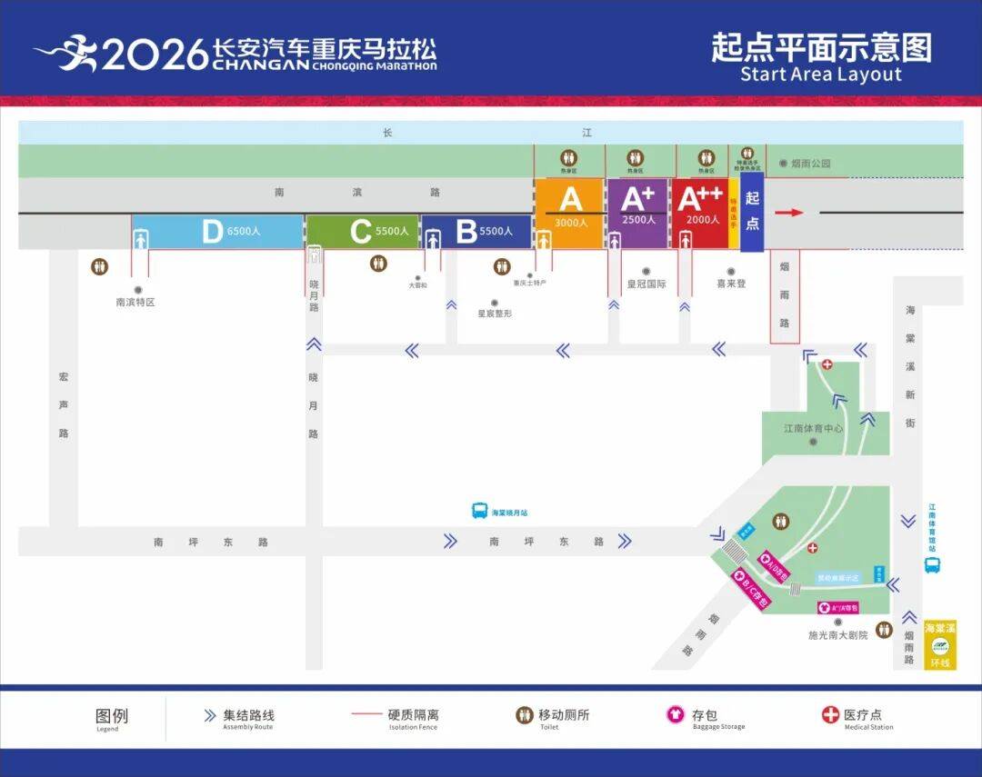 至少预留1小时以上抵达时间,从容完成检录、存包与热身。3.按照参赛号码分区,在指定区域