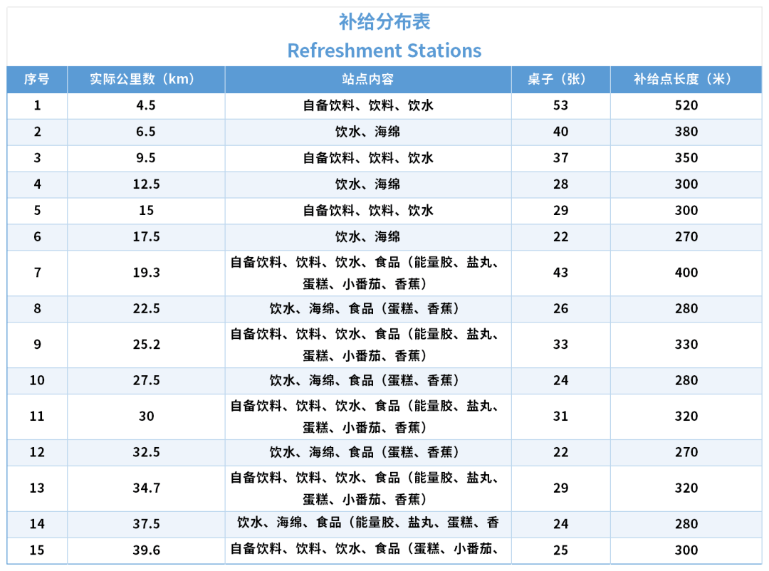 ;大会补给桌布为蓝色;饮水桌布为白色;用水桌布为红色蓝色黄色;能量与食品补给桌布为绿色。2.进出补给站务必注意周围其他选手行进路线,以免发生碰撞。3.建议选手勿拥挤于补给站入口的补给桌,可前进至前方补给桌分散补给。请将废弃物投入沿途垃圾池。