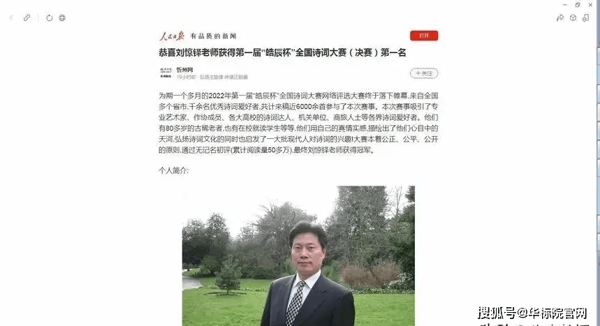 上图为:生态诗人刘惊铎的获奖诗(词)《生态体验》《沁园春·革命伴侣民族魂》蝉联全国诗词大赛冠军。(图片来源:人民日报、中国报道)