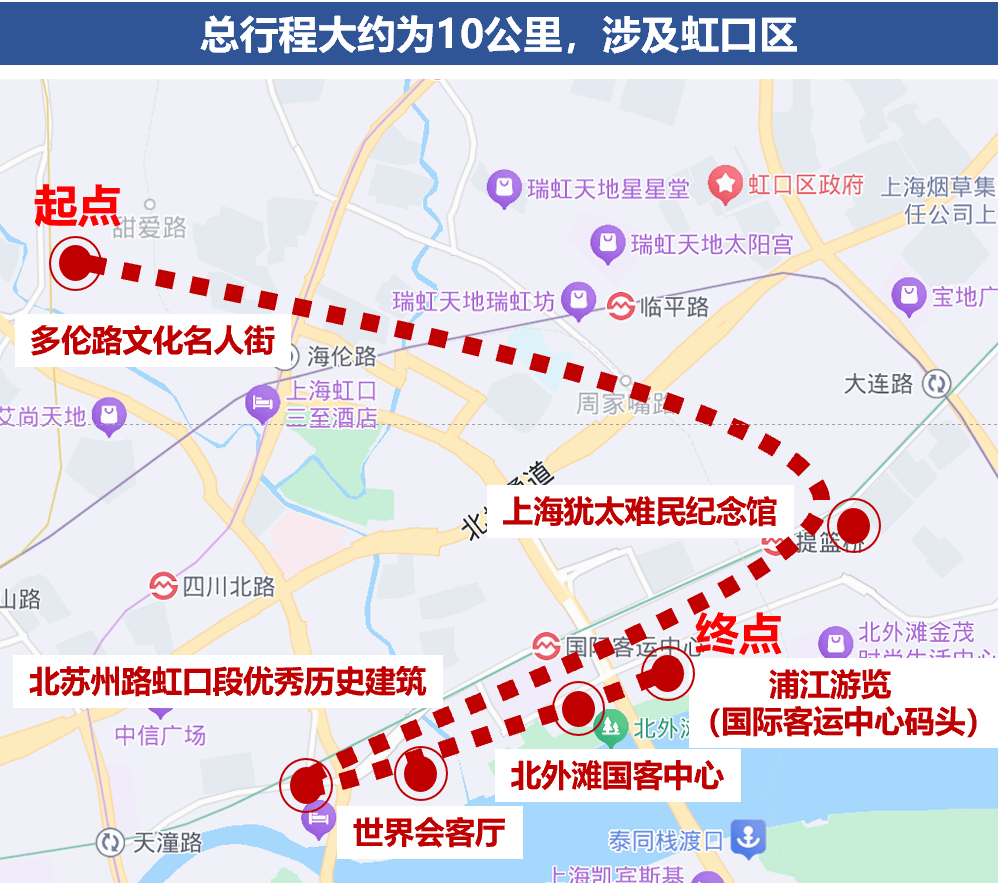 线路设计:多伦路文化名人街→上海犹太难民纪念馆→北苏州路虹口段优秀历史建筑→世界会客厅→北外滩国客中心→浦江游览【国际客运中心码头】