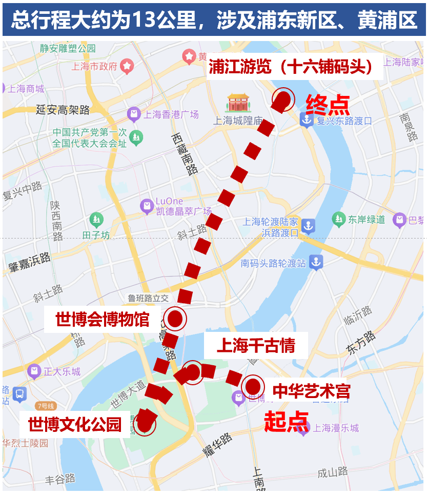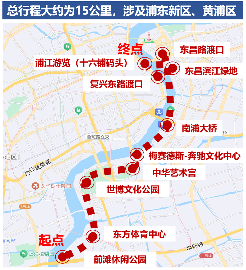前滩休闲公园→东方体育中心→世博文化公园→中华艺术宫→梅赛德斯-奔驰文化中心→南浦大桥→东昌滨江绿地→东昌路渡口→复兴东路渡口→浦江游览【十六铺码头】
