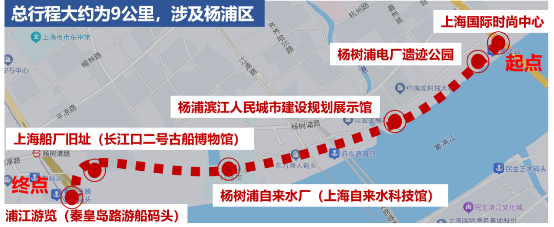 线路设计:上海国际时尚中心→杨树浦电厂遗迹公园→杨浦滨江人民城市建设规划展示馆→杨树浦自来水厂(上海自来水科技馆)→上海船厂旧址(长江口二号古船博物馆,上海博物馆北馆)→浦江游览【秦皇岛路游船码头】