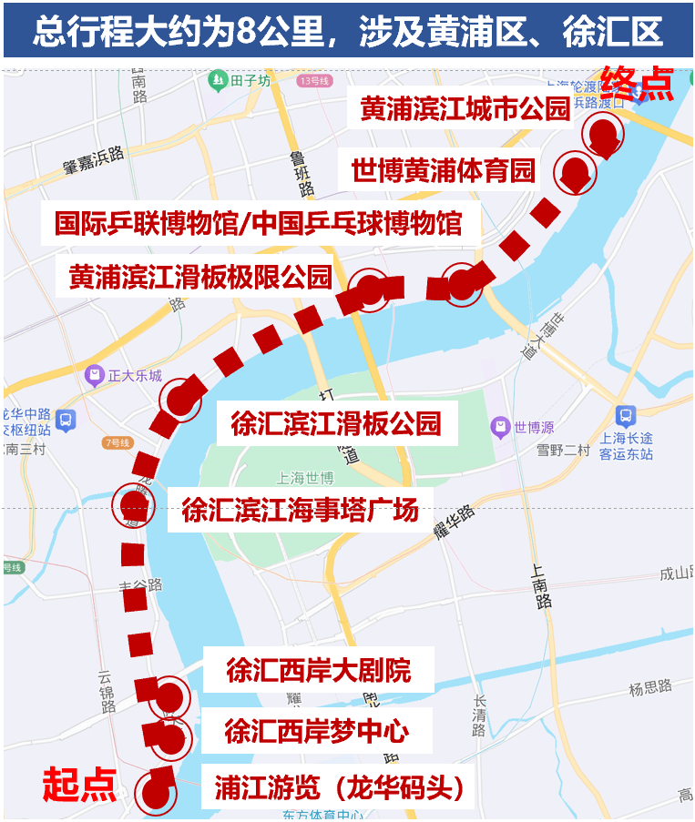 :浦江游览【龙华码头】→徐汇西岸梦中心→徐汇西岸大剧院→徐汇滨江海事塔广场→徐汇滨江滑板公园→国际乒联博物馆/中国乒乓球博物馆→黄浦滨江滑板极限公园→世博黄浦体育园→黄浦滨江城市公园