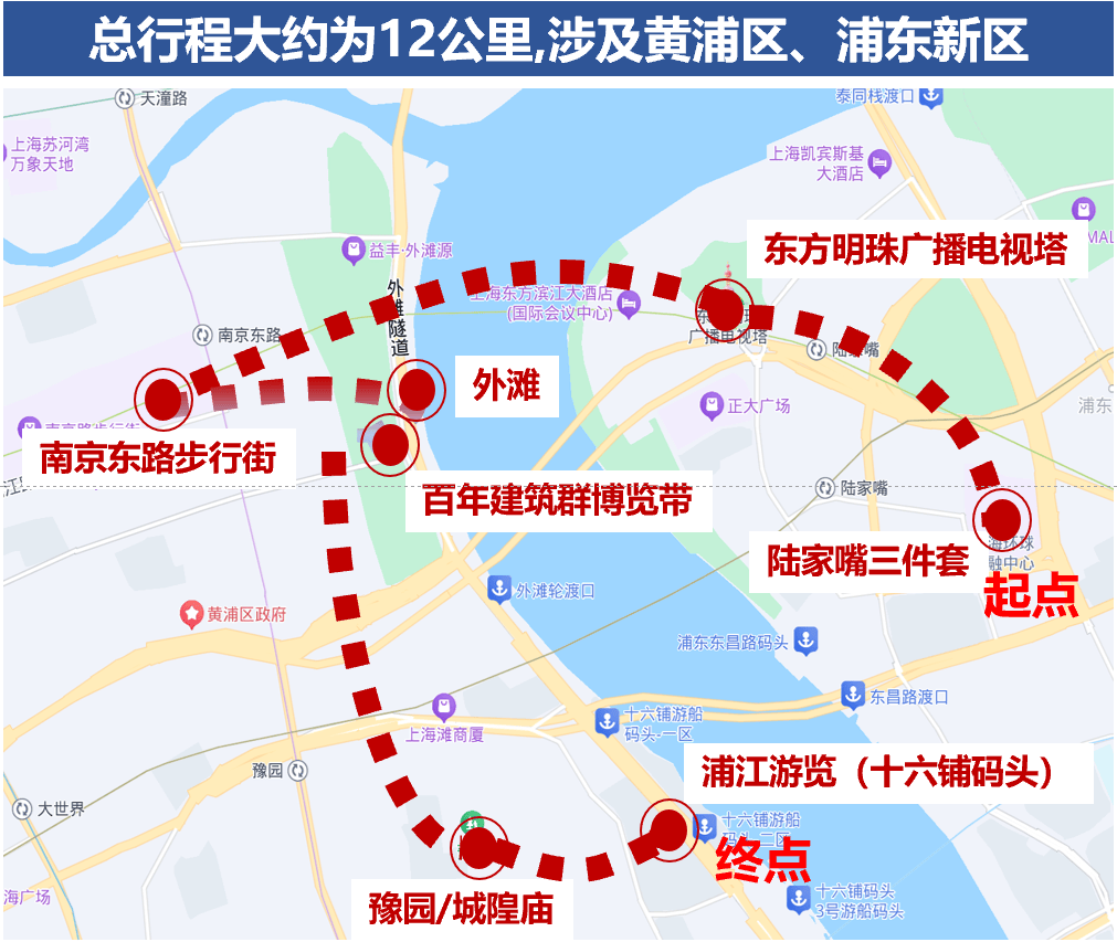 线路设计:陆家嘴三件套(上海中心大厦、金茂大厦、上海环球金融中心)→东方明珠广播电视塔→南京东路步行街→外滩→百年建筑群博览带→豫园→城隍庙→浦江游览【十六铺码头】