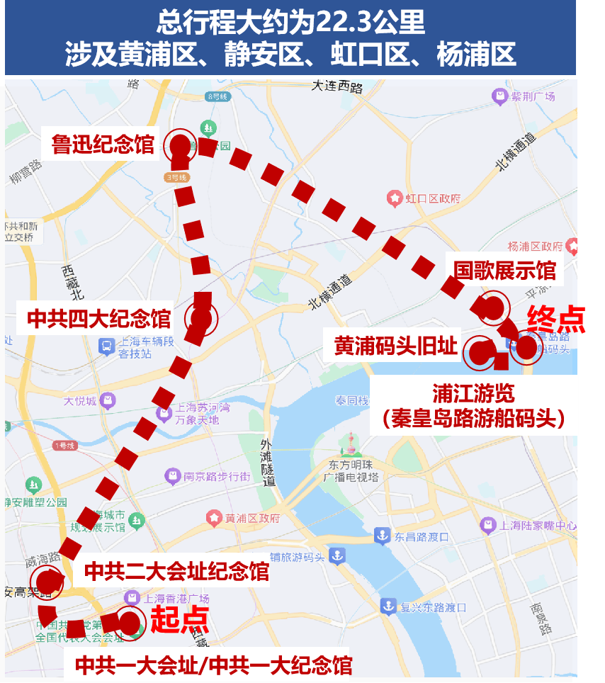 线路设计:一大会址/一大纪念馆→二大会址纪念馆→四大纪念馆→鲁迅纪念馆→国歌展示馆→黄浦码头旧址→浦江游览【秦皇岛路游船码头】