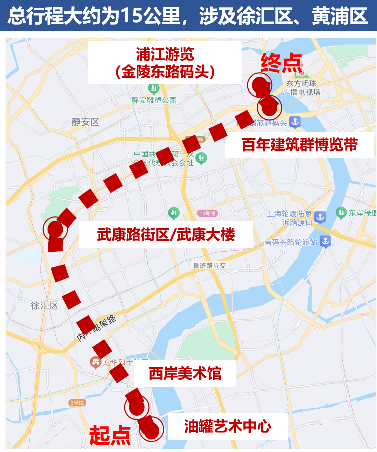 油罐艺术中心→西岸美术馆→武康路街区/武康大楼→百年建筑群博览带→浦江游览【金陵东路码头】