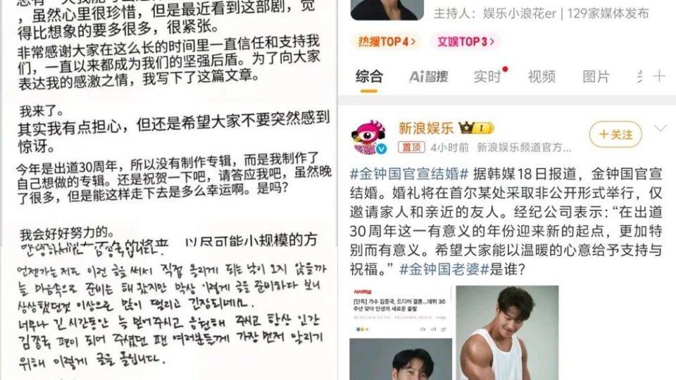 2025年8月18日,韩国流行歌手兼综艺全才金钟国在出道30周年之际,通过手写信向粉丝宣布婚讯:“我结婚了。” 他坦言虽然曾试图暗示,但也预料到了大家依然会被这突如其来的消息震惊,这一切都在控场之外,却也在期待中。婚礼将低调举行,仅限亲友出席,这种真挚与克制,也体现了他一直以来实诚和用心的形象。